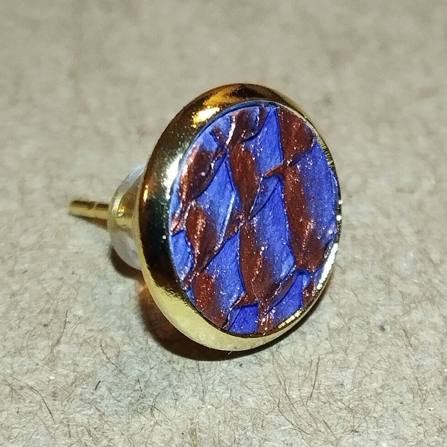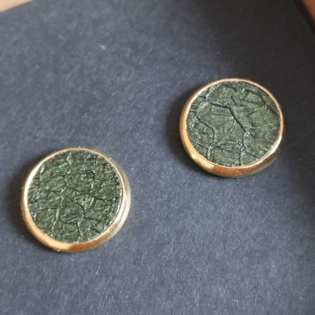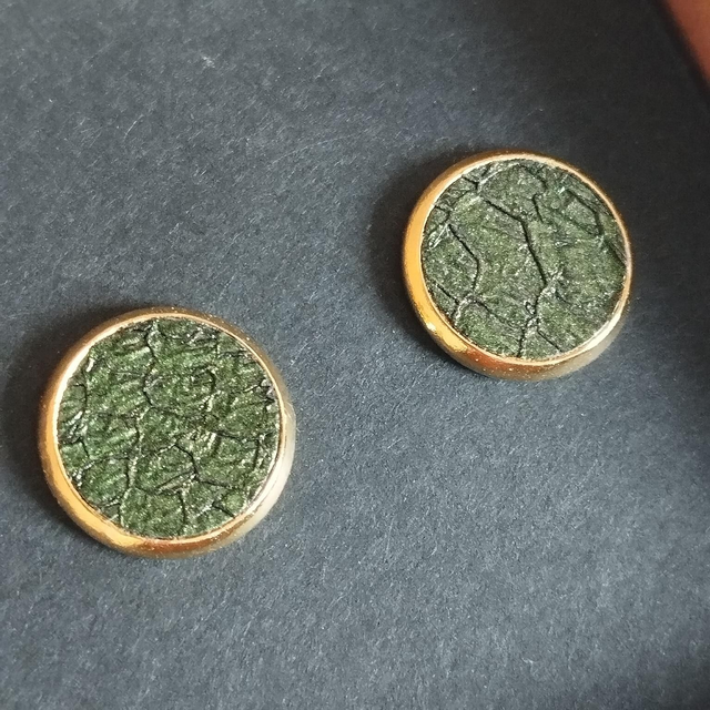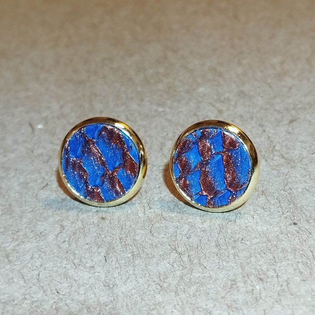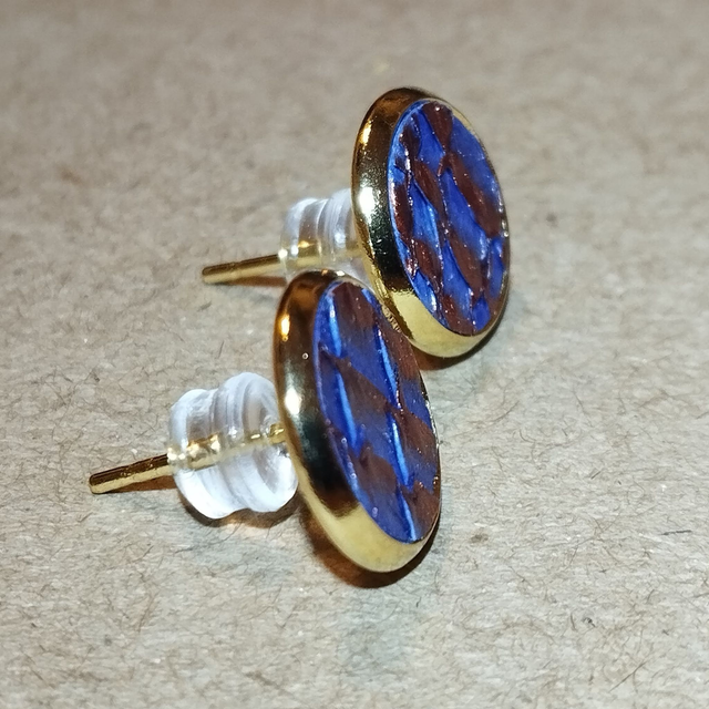 Paire de boucles d’oreilles puces (pour oreilles percées) faite de cuir de saumon tanné à Lyon (ressemblant à de la marqueterie) associé à un support en acier inoxydable doré à l'or fin 24 carats.