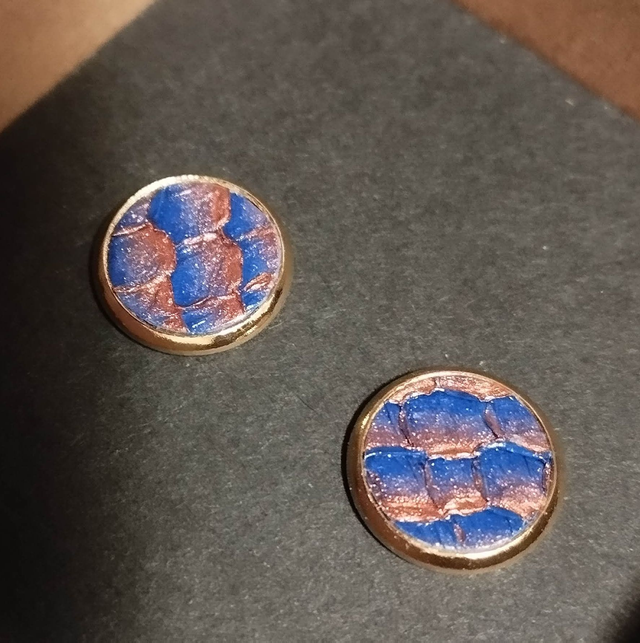 Paire de boucles d’oreilles puces (pour oreilles percées) faite de cuir de saumon tanné à Lyon (ressemblant à de la marqueterie) associé à un support en acier inoxydable doré à l'or fin 24 carats.