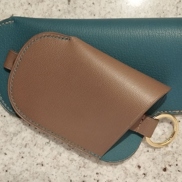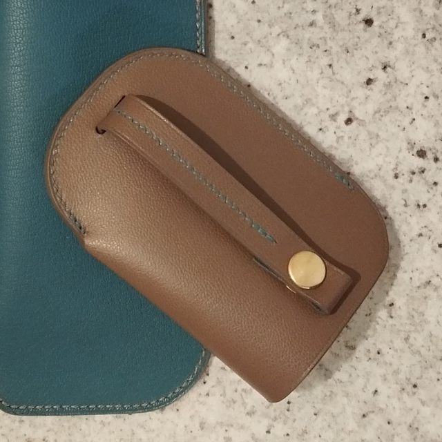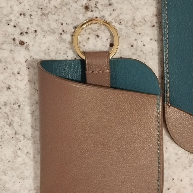 Étui à clés, en cuir entièrement doublé, contenant un porte-clé. Une pression permet de bloquer les clés à l'intérieur ou au contraire de les sortir pour s'en servir.