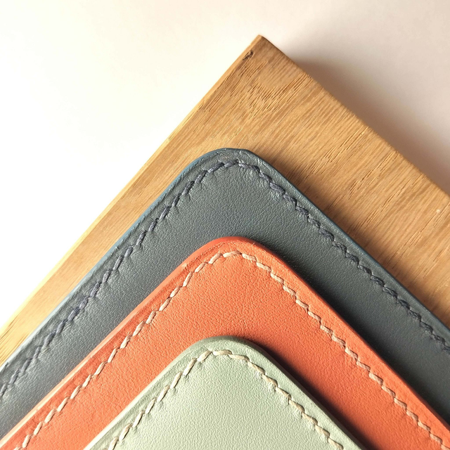 Matériaux : cuir de bovin ou caprin pleine fleur, fil de lin poissé, mousqueton en zamac doré, ruban sergé de coton + lurex ou cordon en cuir