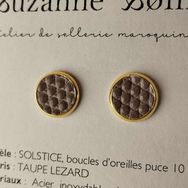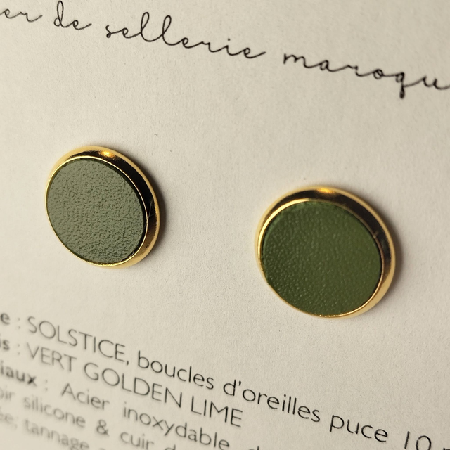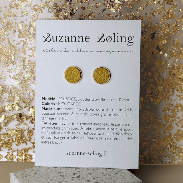 Discrète et très légère, cette paire de boucles d’oreilles puces (pour oreilles percées) associe support en acier inoxydable doré à l'or fin 24 carats et disque de cuir, valorisant les chutes de l’atelier tout en sublimant leurs couleurs et textures uniques.