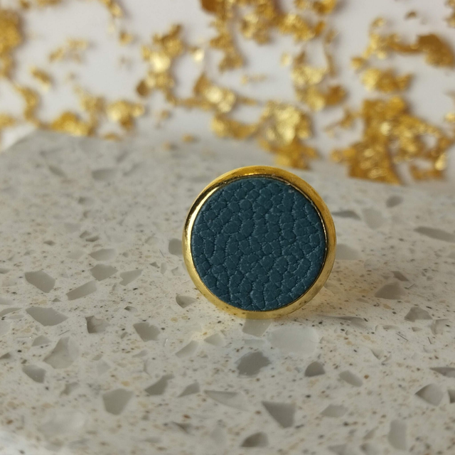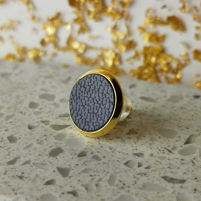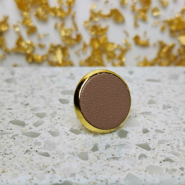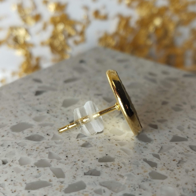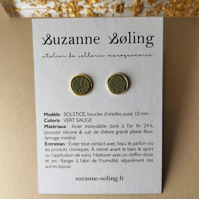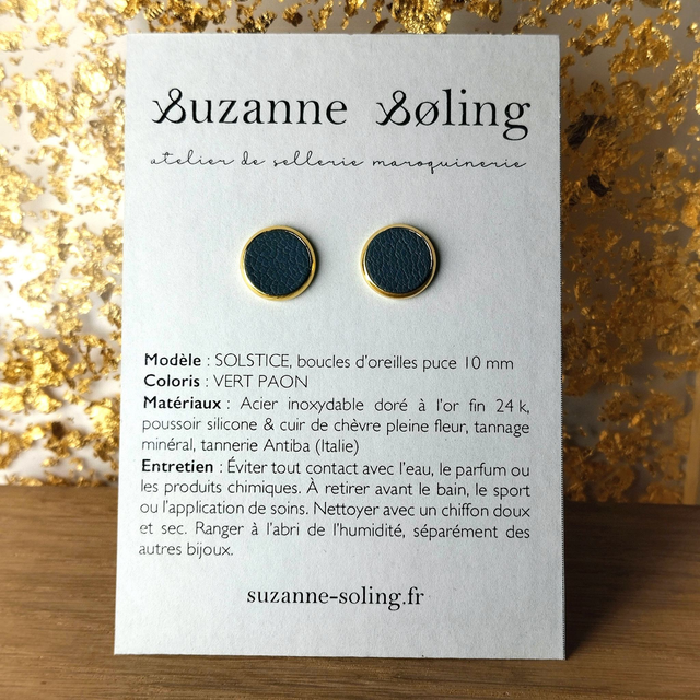 Matériaux : Acier inoxydable doré à l’or fin 24 k (sans nickel, ni plomb, ni cadmium), poussoir silicone & disque de 10mm de diamètre de cuir bovin ou caprin